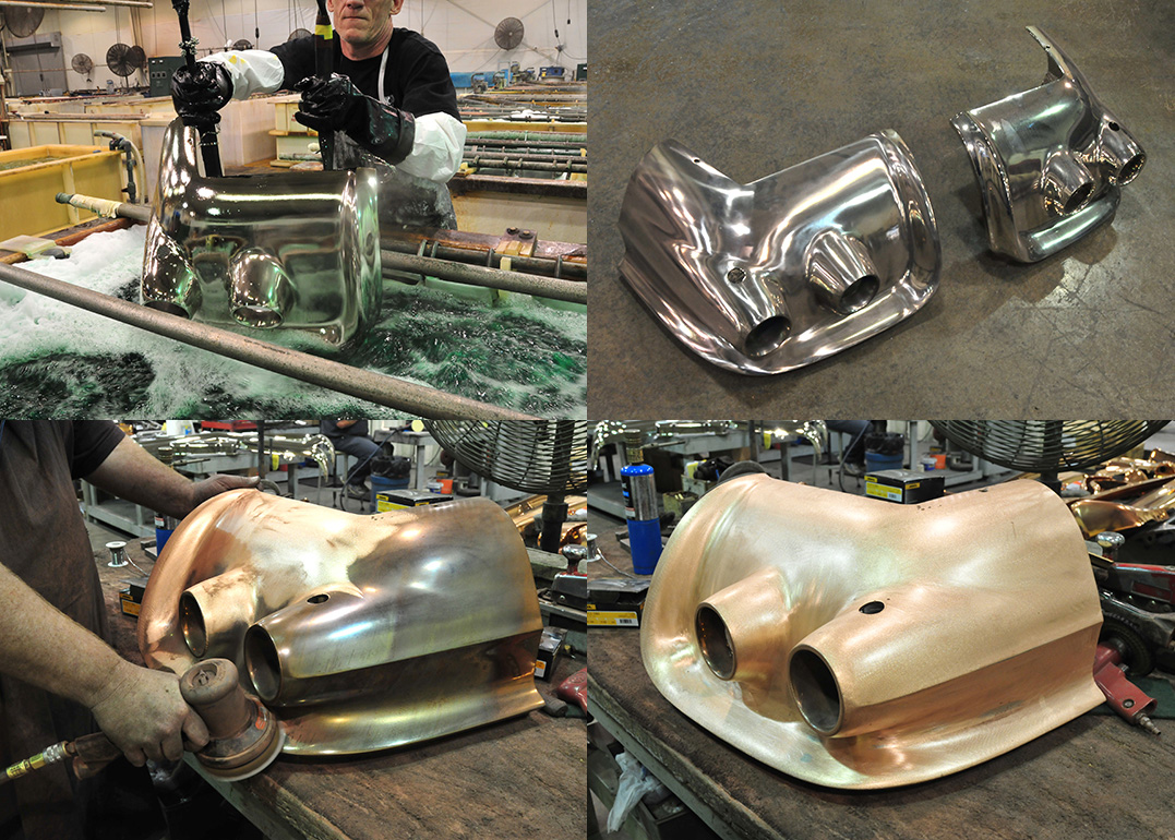 With the shell properly cleaned and activated, it is lowered in to the cyanide copper tank. In a matter of minutes the shell is sealed with a base of cyanide copper plating. Since the cyanide is a thin deposit, the shell is jumped to acid copper for a heavier deposit. The heavier deposit of acid copper allows the polisher to work out any additional waves or inconsistencies that may remain in the shell.