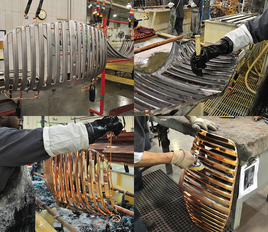 Unlike other metals, we are able to make repairs on the raw brass. Here the polisher solder repairs the cracks on the side of the grille shell. Once the repair is sanded down, the rest of the side is air filed to make sure the surface is flat and wave free. When initial metal finishing was completed, the grille shell was now ready for copper plating. The shell was racked up for plating and thoroughly cleaned in an alkaline bath to remove any contaminants present.