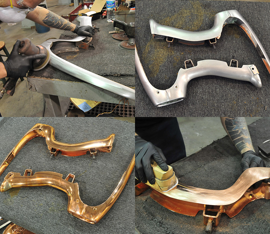 The bumpers have been fully stripped and blasted, so they are now ready for a polisher to work on them. A coarse grit pad is used on a grinder to slide over the entire face of the bumper to remove any pitting or inconsistencies. The initial grind also reveals any dents or dings that need to be hammered out. The grinder is also used to redefine any peaks to make sure they do not become softened during plating.