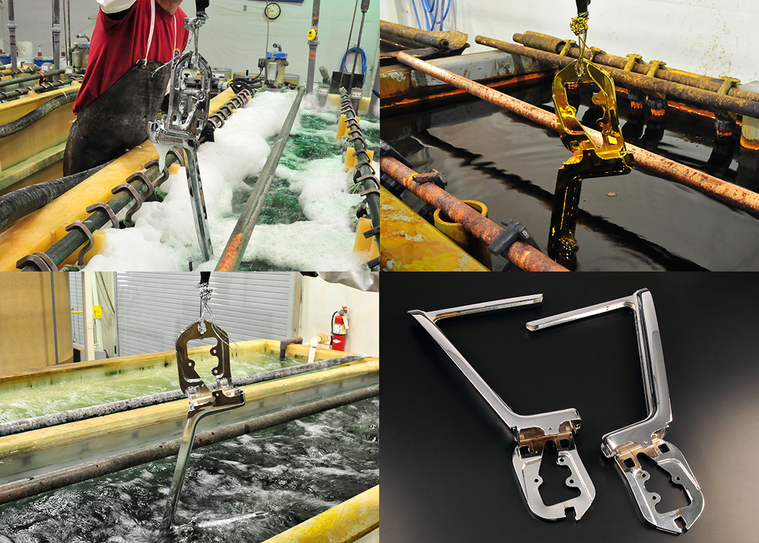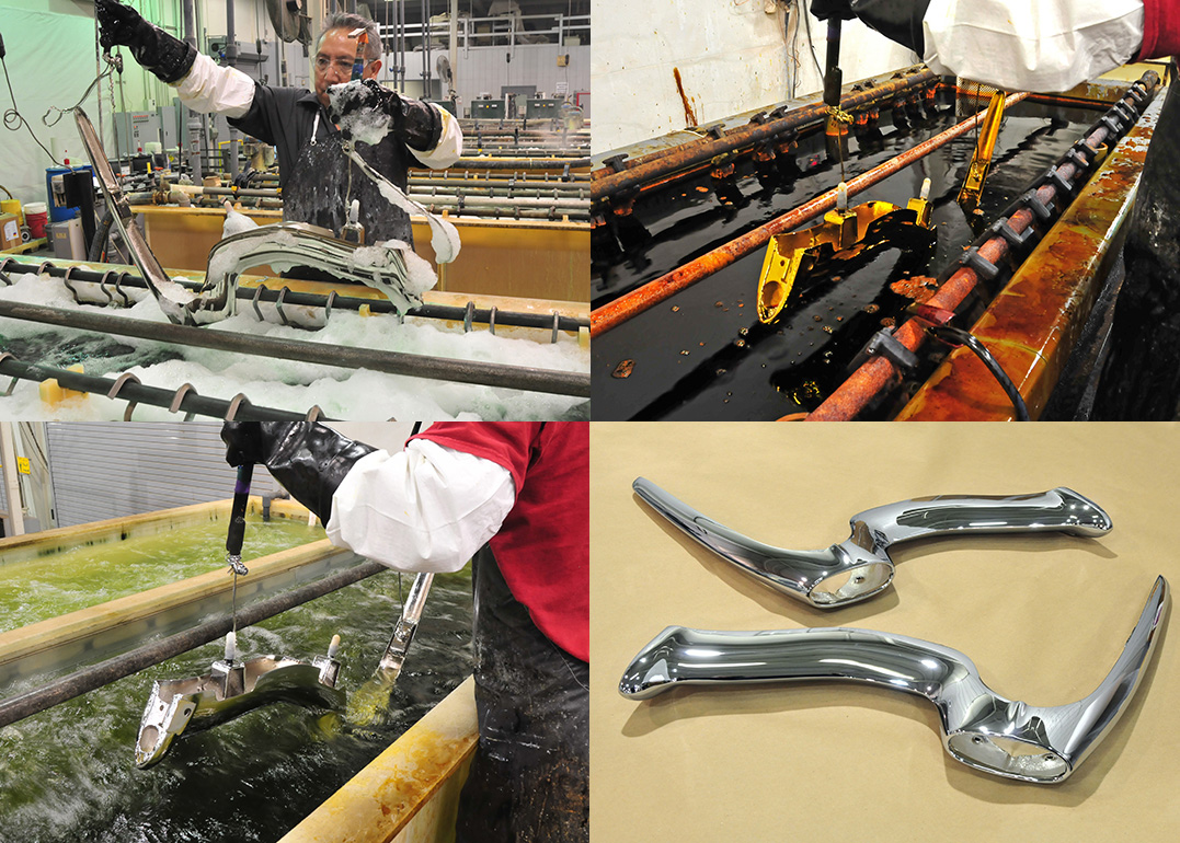 Technicians on the plating line wipe down the polished shell in a soapy alkaline cleaner to remove any impurities on the surface. Once the shell was cleaned, the plating line tech lowers it into the nickel tank for a set amount of time. After the right amount of time had passed, the shell was removed from the nickel and inspected. The hole for the emblem is plugged, to ensure chrome coverage around the area, and the shell is placed in the chrome tank.