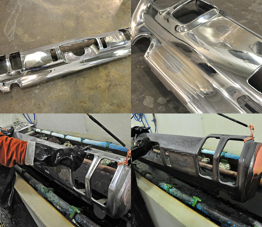 The bumper is then removed from the nickel tank, visually inspected, and moved on to the chrome tank. In no time at all the bumper is lowered into the chrome tank and finally chrome plated. Plenty of rinsing is performed to make sure all the chrome solution is removed. Even with the modifications that were made to this bumper, the modifications are no longer visible after plating.
